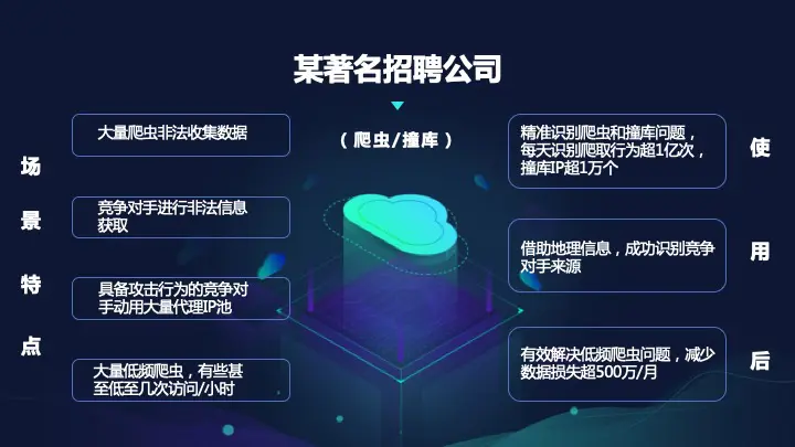 在招聘行业,简历信息对于平台和用户个人而言都极为重要,安全威胁大部分来源于具备攻击行为的竞争对手或第三方数据公司通过大量爬虫恶意爬取用户简历信息,对招聘平台用户量及数据保密工作造成严重影响,从而直接影响平台整体利益。