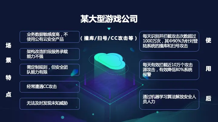 目前游戏公司存在的安全威胁主要包括了撞库、扫号、CC攻击、外挂、批量注册等,其安全防护体系还主要依靠威胁情报中心、设备指纹识别、策略&规则等方式,在解决滞后性、误判误报、未知威胁识别等问题上依然存在技术瓶颈。