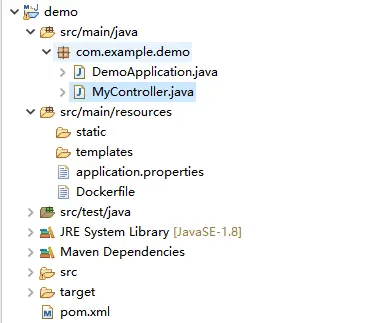 其中application.properties文件没有任何内容,我们在resources目录下新建一个Dockerfile文件,内容如下: