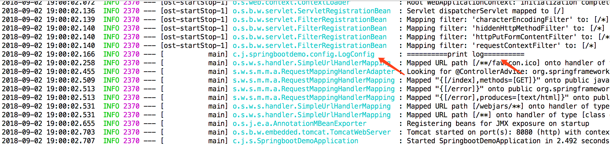 我们看到打印的日志内容左侧就是对应的类名称,这个是通过private static final Logger LOG = LoggerFactory.getLogger(LogConfig.class);实现的。