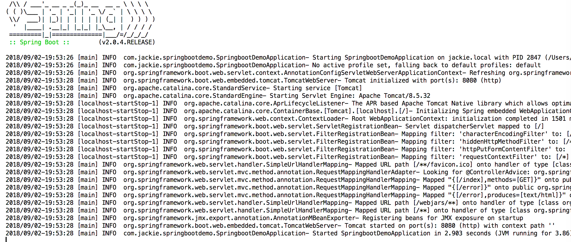 运行SpringBootDemoApplication,可以看到控制台的日志