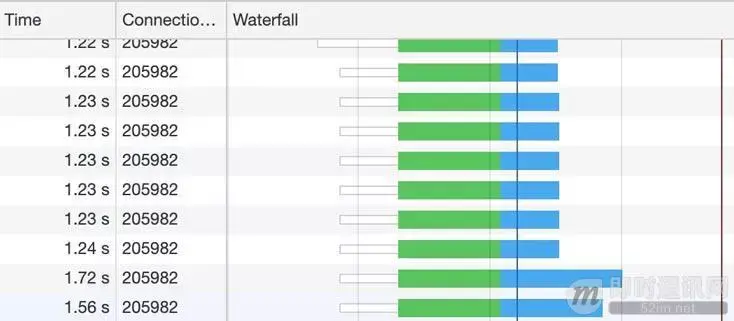 ▲ 绿色是发起请求到请求返回的等待时间,蓝色是响应的下载时间,可以看到都是在同一个 Connection,并行完成的