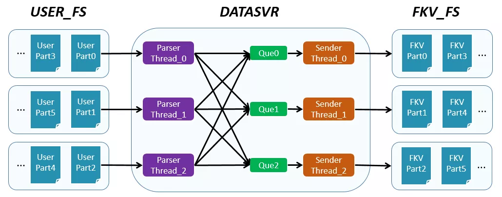 二是每个 DataSvr 负责生成部分编号的 FKV 文件,每次都读入全量的用户输入,批处理生成一批编号的 FKV 文件。