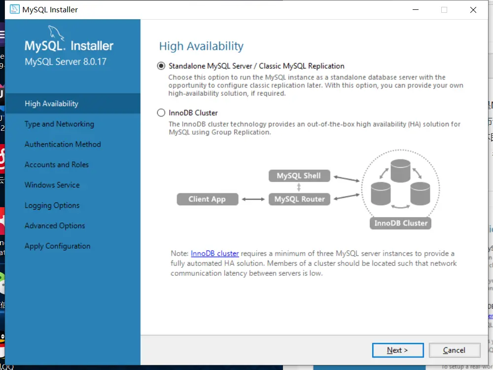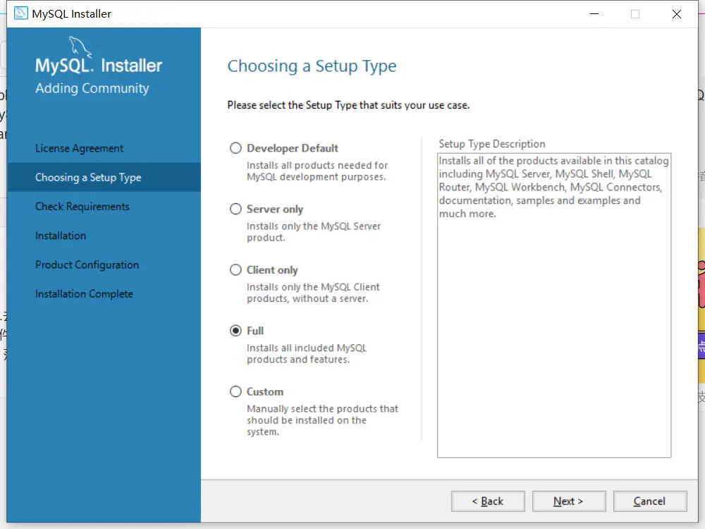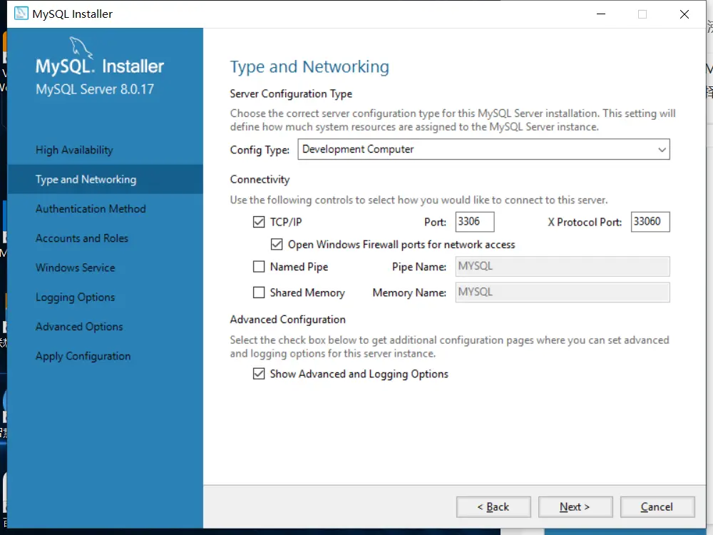 8、该界面是配置Mysql监听类型和网络,此页面配置类型选择开发者电脑,连接协议、端口、方式、高级设置等选择默认配置即可