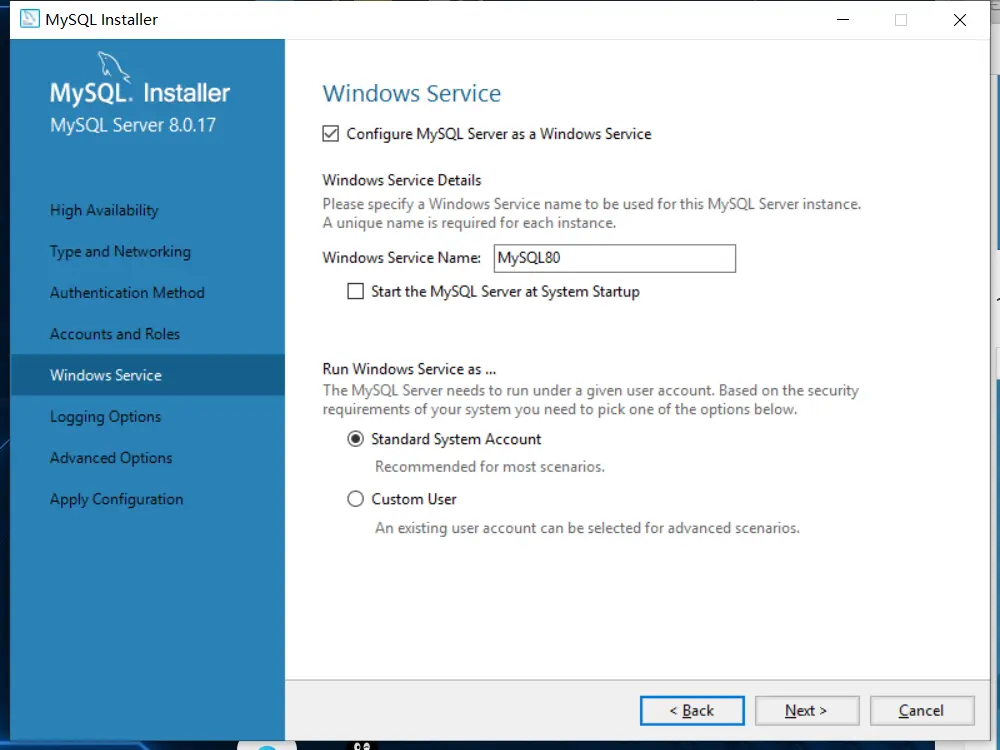 11、z设置Mysql的服务名和启动方式,默认时选择随电脑开机启动,完成点击下一步