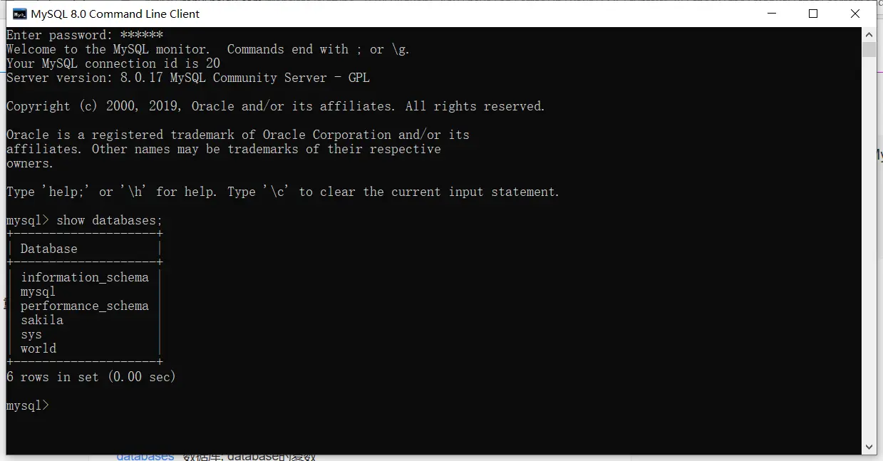 输入show databases可查看数据库相关信息即证明安装成功,如下:
