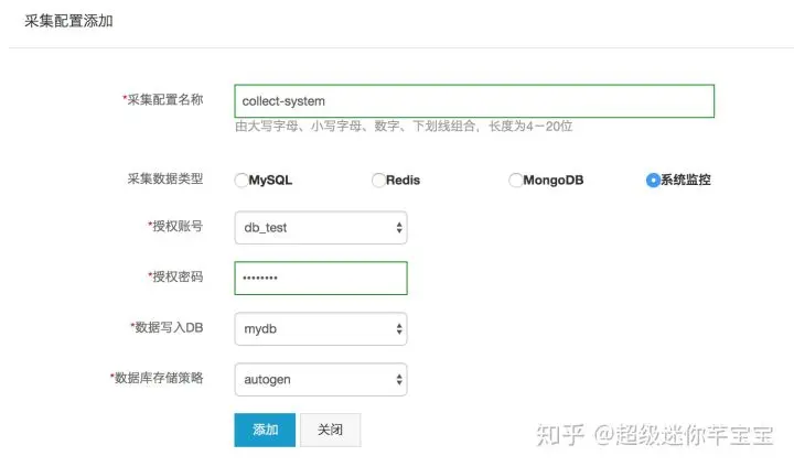 点击InfluxDB®管理控制台左侧导航栏的“添加采集配置”,进入到采集配置添加界面,如下图所示。填写“采集配置名称”,选择“采集数据类型”为“系统监控”,然后选择“授权账号”、“数据写入DB”和“数据库存储策略”,并填写“授权密码”。点击“添加”即可成功创建采集配置。