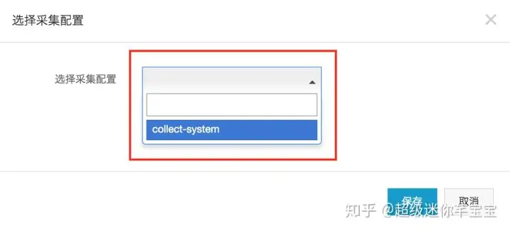 (3)选择采集系统监控的数据。在上图中,点击“选择采集配置”,进入如下界面,从下拉框中选择刚刚创建的名为“collect-system”的采集配置。选择完成后,点击“保存”。
