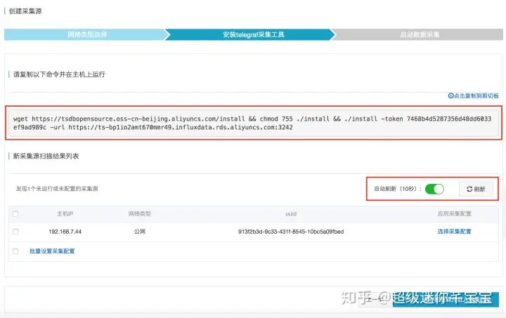 (2)在数据源所在主机安装采集工具。将安装命令复制到主机上即可运行采集工具。采集工具运行后会与InfluxDB®建立连接,在“新采集源扫描结果列表”上可以看到新添加的采集源,如果在该列表上没有显示,可以点击“刷新”或“自动刷新”。如下图所示。