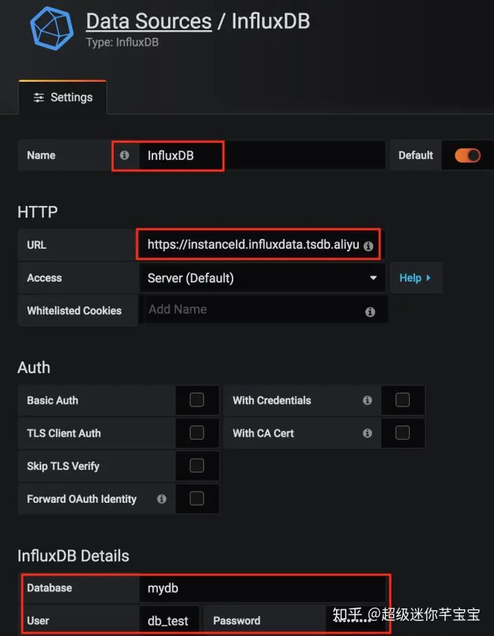 (2)添加数据源。设置“URL”为InfluxDB®实例的地址,并且填写采集数据所写入的数据库和用户账号,如下图所示。