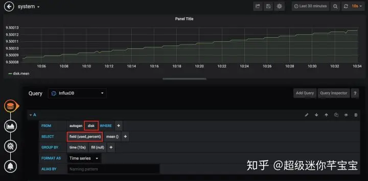 SELECT MEAN("used_percent") FROM "disk" GROUP BY time(10s)实时查询结果如下图所示。