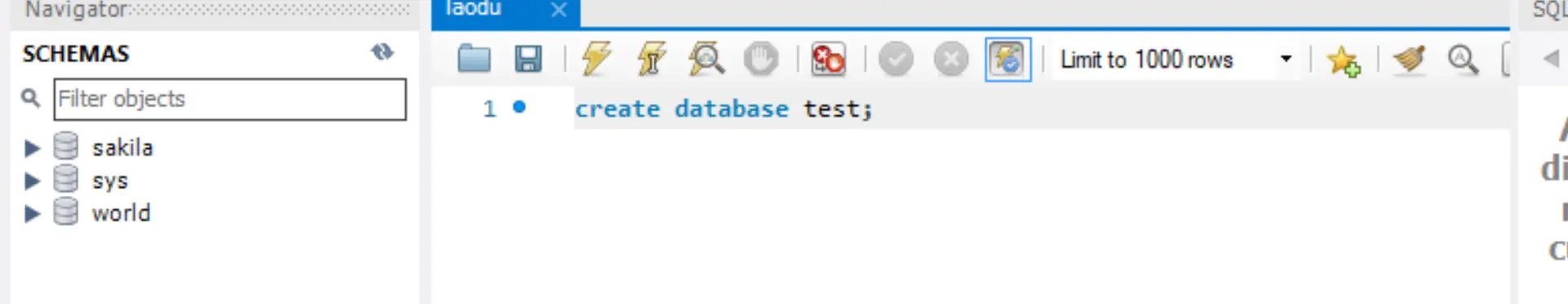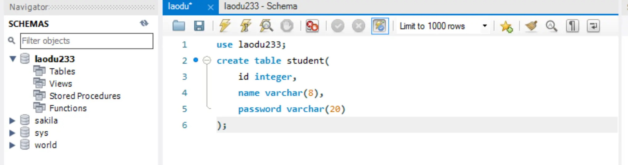 创建数据表要使用use指明要使用的数据库,(或者也可以在左侧数据库上面点击右键选择Set as Default Schema,选择默认的数据库,就不用use声明了)