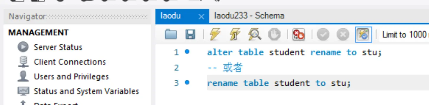 更改数据表名:alter table old_name rename to new_name或rename table old_name to new_name