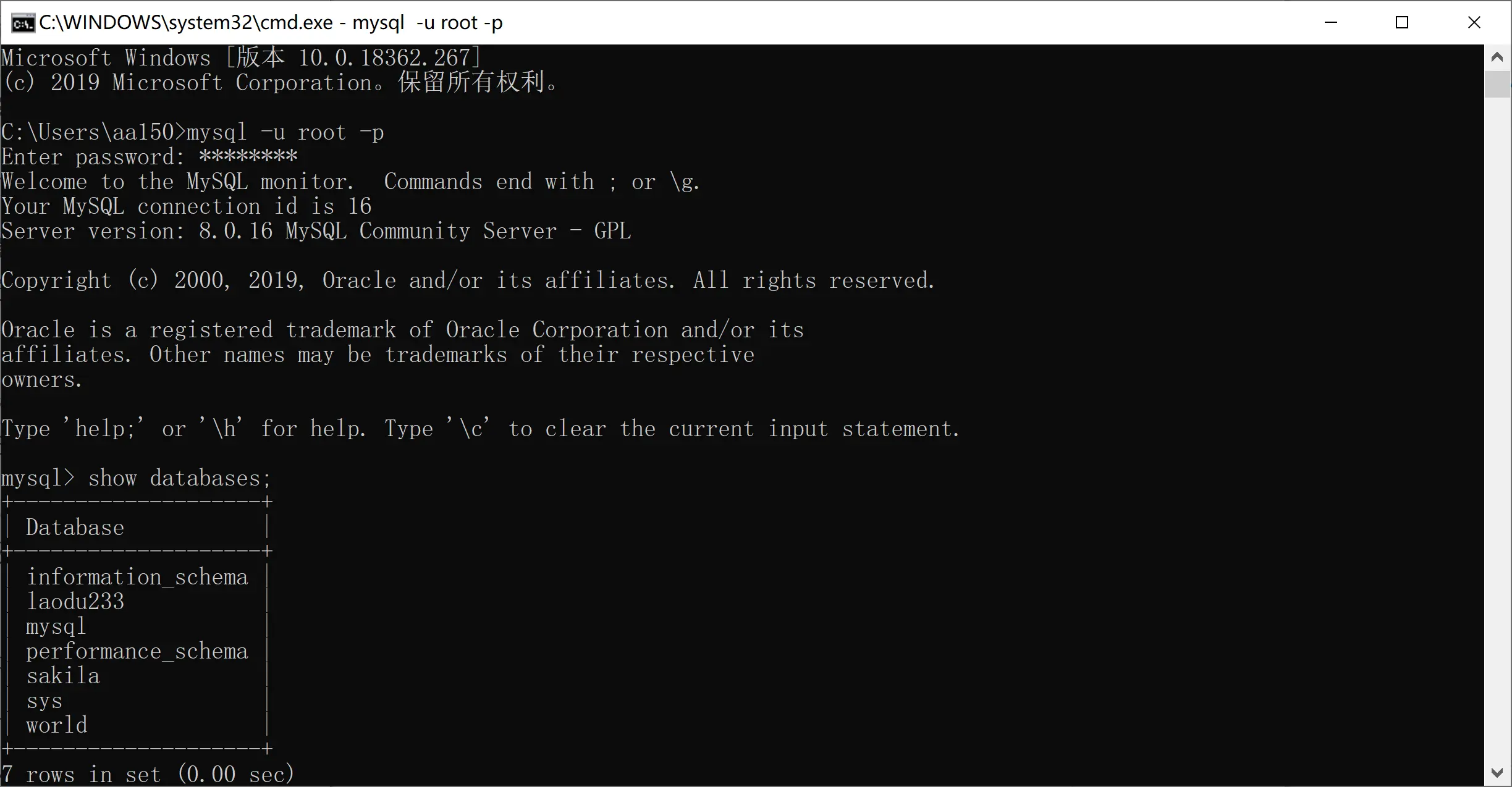 在命令行中输入mysql -u root -p然后回车,输入密码就会进入MySQL管理界面