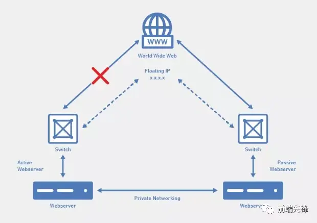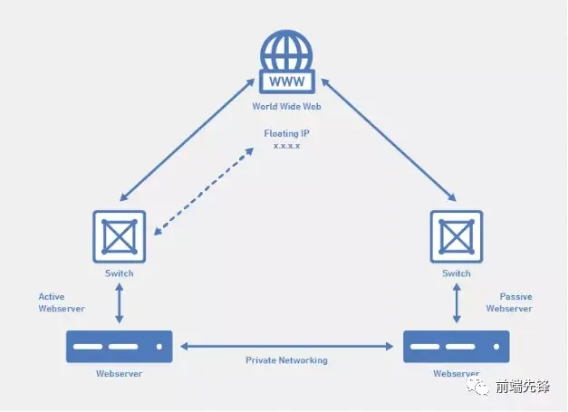 在上面的示例中,有两个相同的服务器处于主从模式,其中托管了相同的网站。网站的 DNS 指向浮动 IP。浮动 IP 将流量定向到活动服务器。如果活动服务器出现故障,通过对浮动 IP 地址的更改会将流量定向到从服务器的 IP,这可确保使流量流向从服务器。