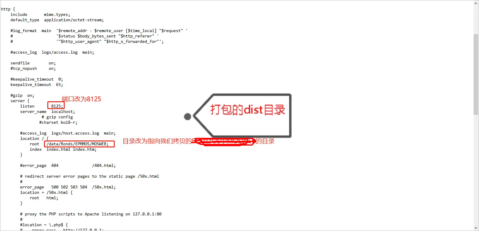 - 进入目录/usr/local/nginx/conf,修改nginx配置文件nginx.conf,配置如下: