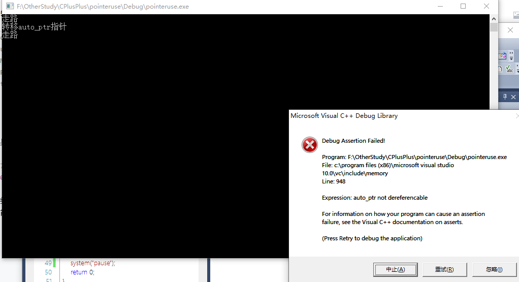 //使用常规new指针 bool useNormalPtr() { People * p_People = new People(); p_People->doWalk(); People* p_MPeople = p_People; cout << "转移auto_ptr指针" << endl; p_MPeople->doWalk(); p_People->doWalk(); cout << "p_People地址" << endl; cout << p_People << endl; cout << "p_MPeople地址" << endl; cout << p_MPeople << endl; delete p_MPeople; return true; }代码比较简单,运行结果: