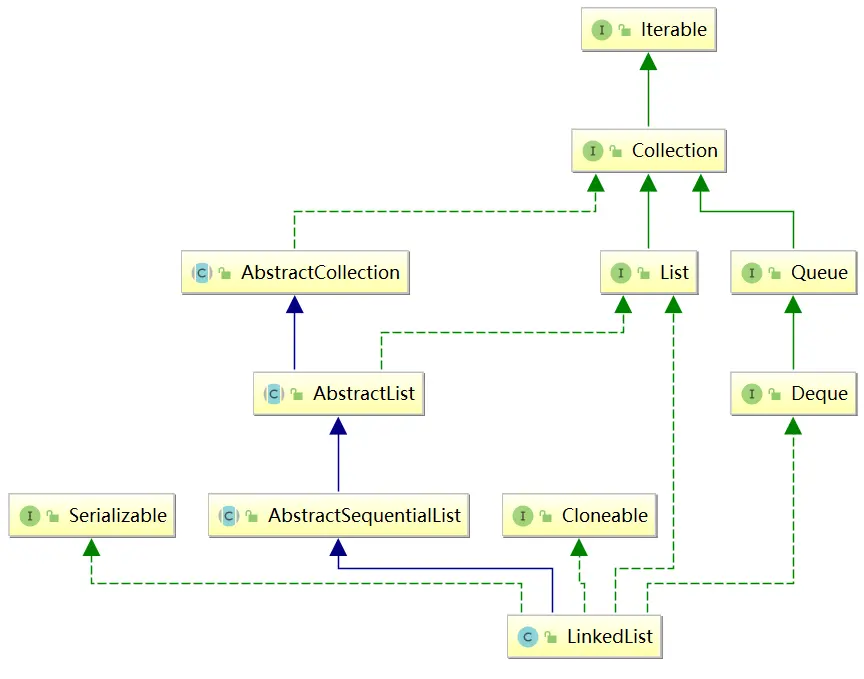 直接通过idea查看一下LinkedList的继承体系,体系结构比较复杂,一点点看。