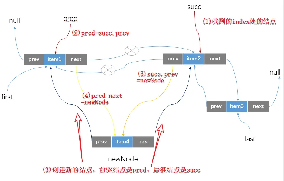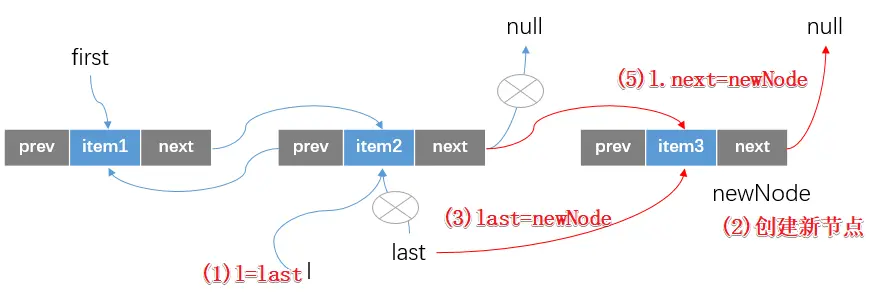 //(5)不为null,因为是双向链表,创建新节点的时候只是将newNode的prev设置为原last结点。这里就需要将原last