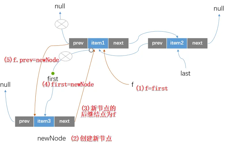 上面的逻辑也比较简单,就是将新添加的结点设置为头节点,然后更新链表中结点之间的指向,我们通过下面这个图简单理解一下(链表初始为null就不做演示了,和上面图示的差不多,这里假设已经存在结点)