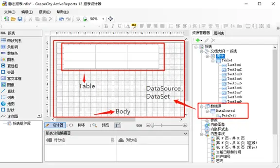 以ActiveReports桌面报表设计器中的一张报表为例,报表通常包含页面渲染部分和数据两部分: