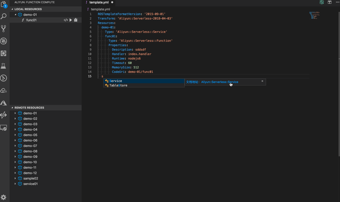 - 提供模版文件 template.yml 资源配置文档地址。在 template.yml 中,输入符合正确缩进的资源名,会列出匹配的资源名列表,资源名右侧会显示资源配置文档地址,鼠标左击可跳转到相应地址。