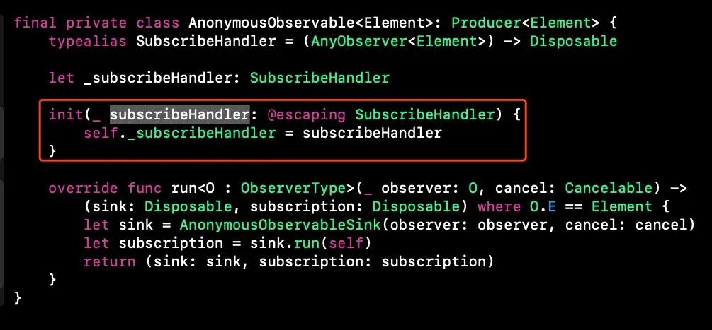 代码返回的数据是return AnonymousObservable(subscribe),即create的调用是把我们的闭包传给AnonymousObservable初始化