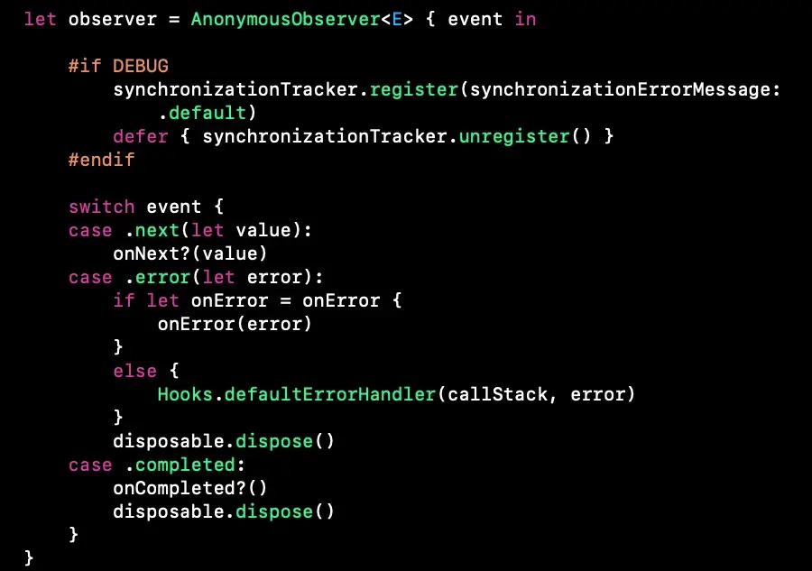 这里我们看到了,创建了一个观察者observer,这个观察者是AnonymousObserver的观察者,这个观察者的构造是用过尾随闭包将以上的onNext``onError``onCompleted传入的,其实现如下