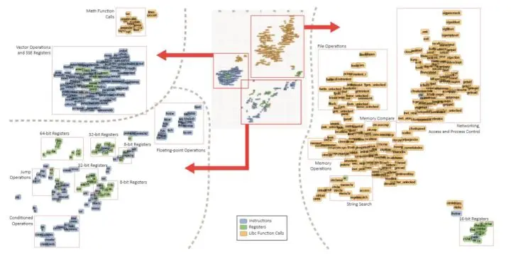 因此需要有比较好的方法,既能够将结构化信息保留,又能够将语义信息提取出来。该文通过T-SNE的聚类方法,对于所有的操作指令和操作数进行了可视化。
