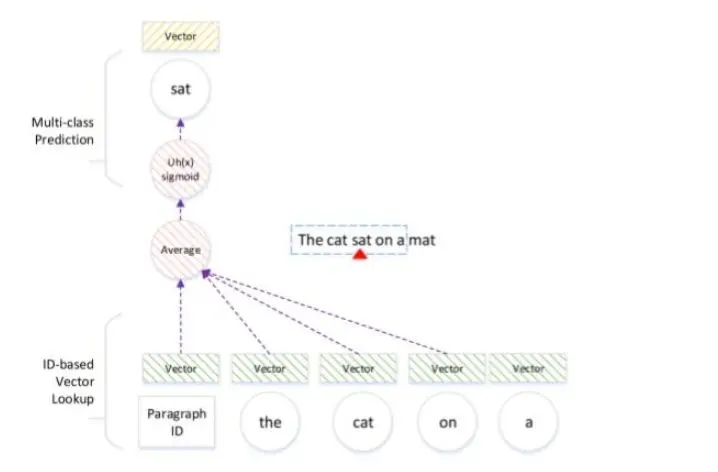 但是除了解决语义的问题,仍有二进制结构性的问题亟待解决,如何将混淆和非混淆的二进制进行相似度的对比,是一个很难的问题。值得庆幸的是,NLP领域已经有类似问题的解决方案了,就是PV-DM。其核心思想就是多存储一个和段落相关的字段,以获得结构化的信息。如下图所示,以“The cat sat on a mat”这句话为例,抽取“sat”这个词的对应向量,就是通过结合段落ID和前两个单词以及后两个单词的向量维度取平均值,最后通过sigmoid的函数来获取最终的向量计算结果。
