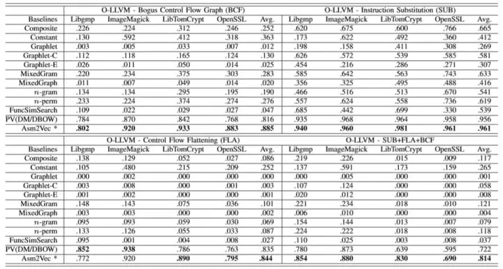 更令人惊喜的是,当经过LLVM等工具的混淆之后,其相似度的检出率还是比较高,且能与其竞争的方法仅有原始的PV-DM的方法了,可见其对于原有结构化信息的还原程度之高。