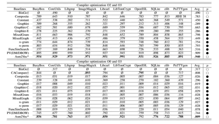 从图中可以看到,之前的工作,在O2和O3的比较上,其实还是有比较可以接受的对比结果,但是在O0和O3上,其结果几乎难以接受。从这篇工作的结果可以看到,在各个优化等级的表现下,其结果都是令人可接受的。这也可以看得出来,这种基于PV-DM的新型表示方式,还是有非常有效的结果,可以同时提现其语义和结构化信息的。