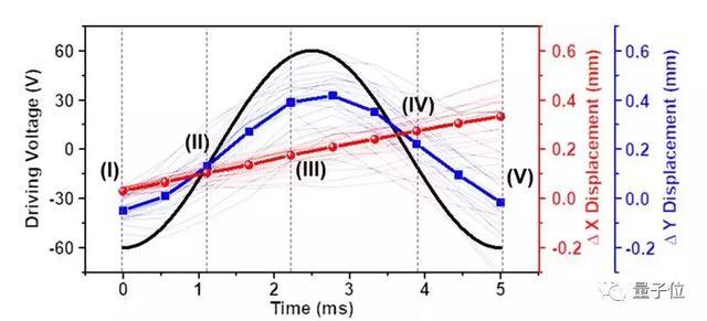 蓝色则是小强机器人脊背的高度变化,随着电压波动,在电压为-60V、0V、60V、0V这四个时间点上(也就是图上的I、II、III、IV),小强一直在变化自己的身姿,脊背的高度也在随着波形变化;而当一个周期结束,电压回到-60V的时候(也就是图上的V),小强的姿势也回到了最初状态。