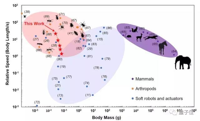 其中紫色区域代表哺乳动物,橙色区域代表节肢动物,蓝色区域代表不同软体机器人的与体重的相对运行速度。