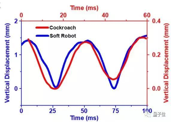 如果将小强机器人运动中的脊背高度变化拉长,拉到和生物界中真的小强一样的运动周期50毫秒,会发现两者的脊背高度波动几乎是重合的。