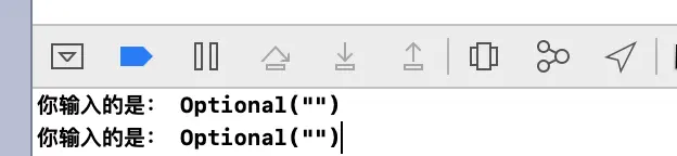 command+R运行代码,此时先不做任何交互操作,会发现打印出了你输入的是: Optional(""),然后点击textFiled准备输入内容,这时候再次打印了你输入的是: Optional(""),