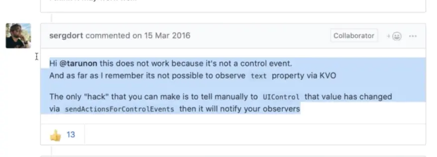 对于问题2:textFiled的text进行赋值,subscribe闭包不执行,问题在于RxSwift的底层是event的封装,而对textFiled的text进行赋值并不是一个event事件,而且也不是一个KVO的形式,解决这个问题的方法可以在RxSwift的GitHub Issues讨论区里面看到,利用sendActions(for: .allEditingEvents)方法: