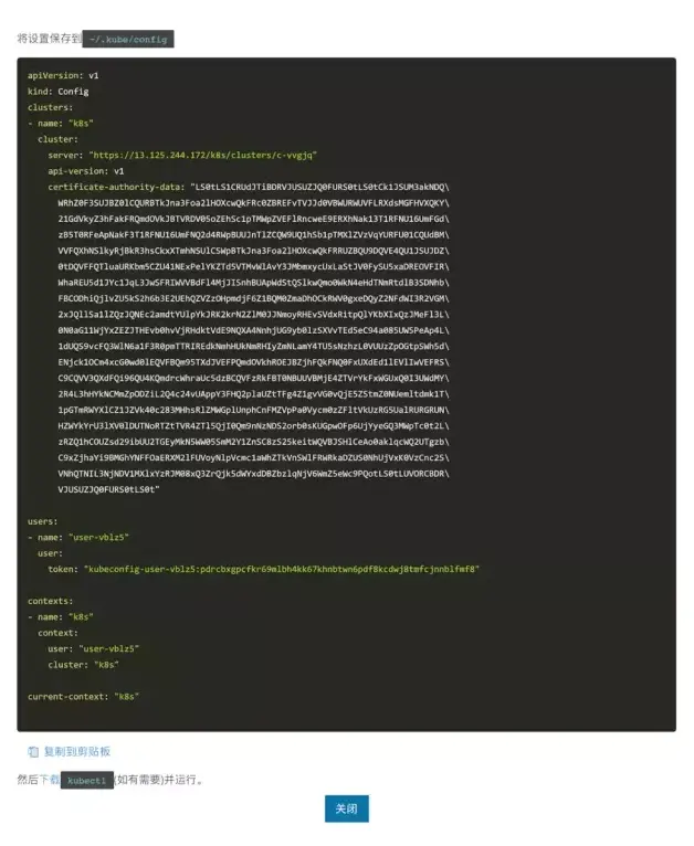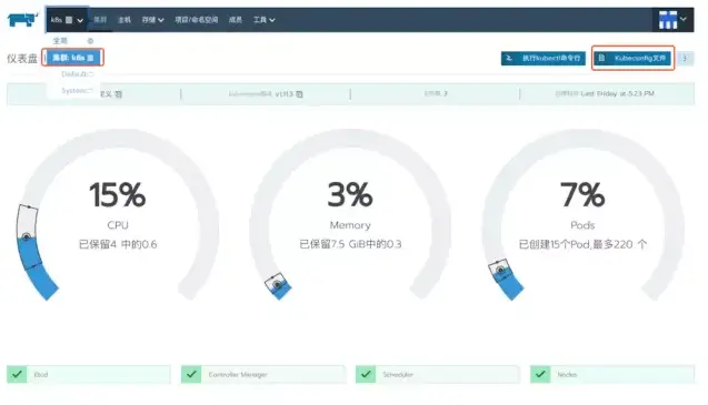- 进入Rancher集群页面,点击Kubeconfig文件。
