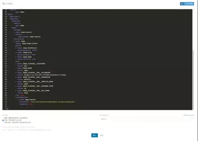修改Deployment,将环境变量中的EMQX_CLUSTER__K8S__APISERVER改为Rancher的Kube-apiserver的地址,增加volumeMounts