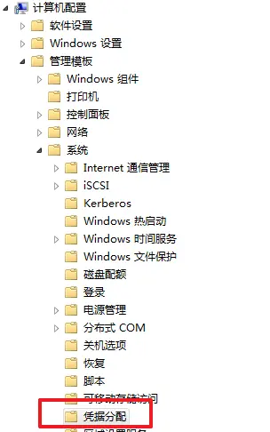 2、在组策略左侧依次展开:计算机配置 > 管理模板 > 系统 > 凭据分配