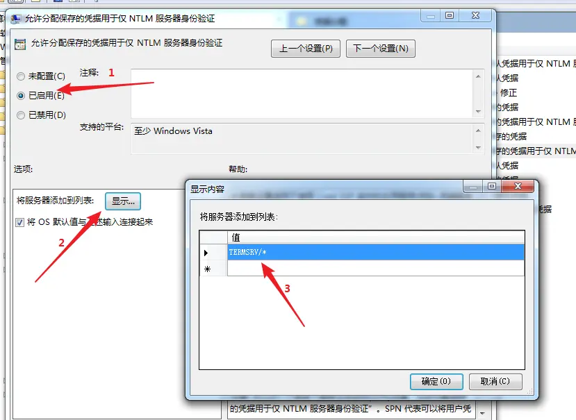 3、在右侧双击打开 【 允许分配保存的凭据用于仅 NTLM 服务器身份验证 】 ,启用它,并在“将服务器添加到列表” 中添加 TERMSRV/*。