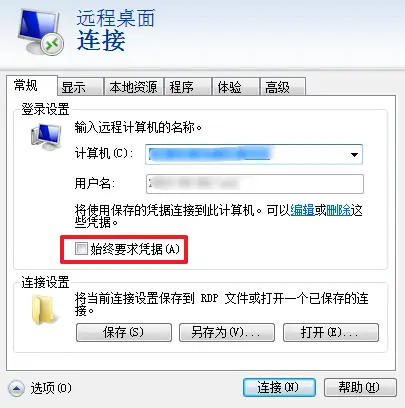 4、在远程桌面连接客户端软件中取消“始终要求凭据”这个选项: