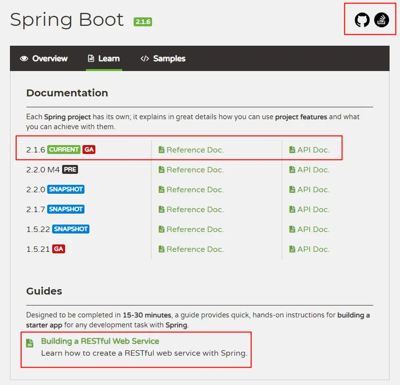 Learn页右上角上面,可以看到SpringBoot作为一个开源项目的源代码是托管在Github上面的,另外也著名的问答网站StackOverflow上面有一个主题,据说是会有SpringBoot的贡献者来回答相关的问题。