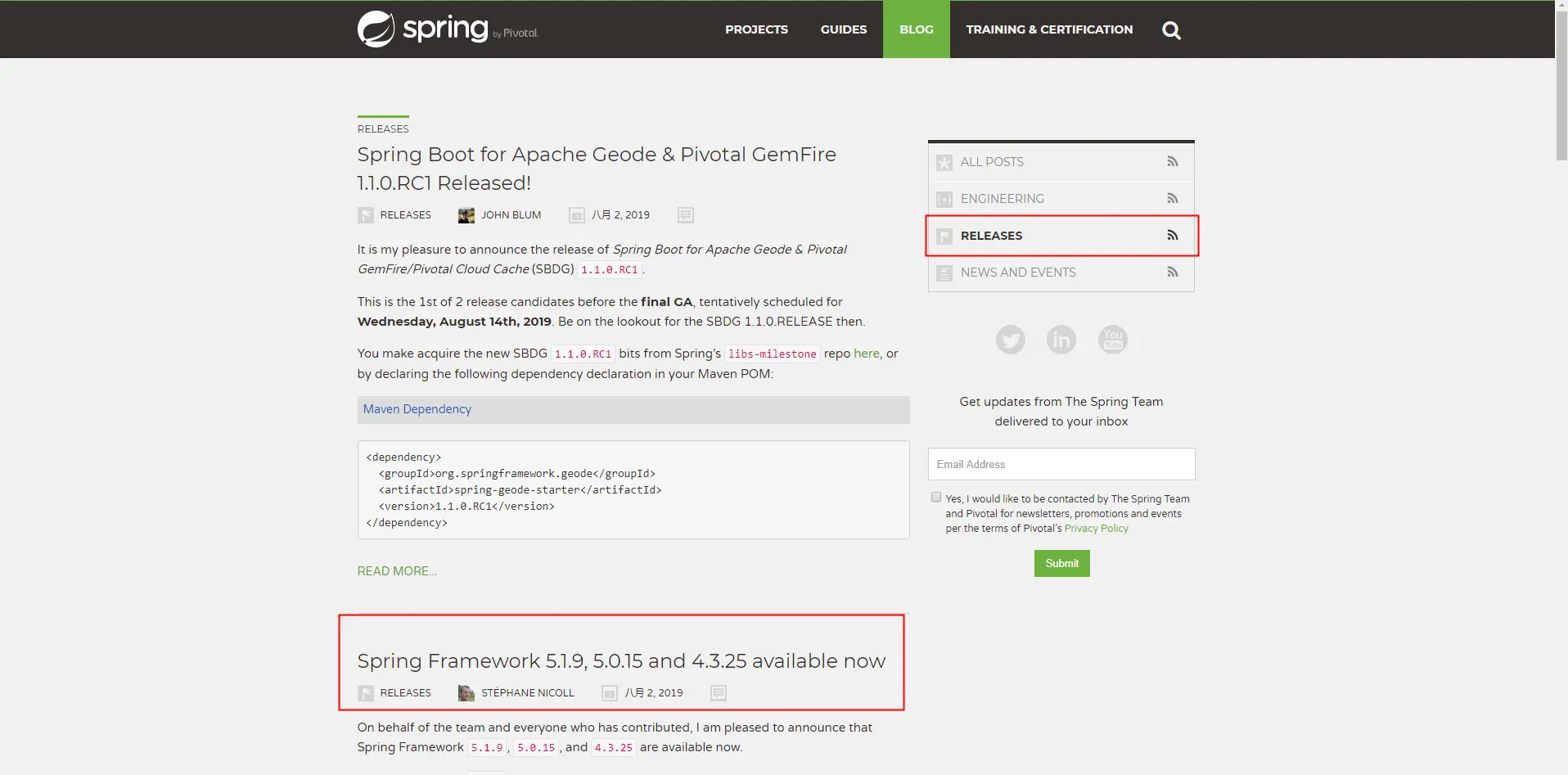 在Spring的官方文档的顶级分类中,除了上述Projects和Guides。还可以看到两个分类,一个是Blog,另外一个是Training&Certification。 其中Blog提供了RELEASES的新版本的发布信息。你可以看到就在昨天,Spring Framework还更新了三个不同的版本,分别是5.1.9,5.0.15和4.3.25。