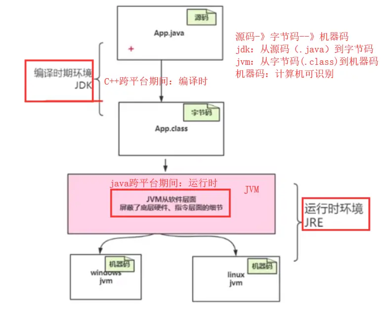 - java中跨平台与C++跨平台的区别:java中跨平台的意义在于jvm(运行区间)的跨平台;而c++跨平台在于jdk(编译期间)跨平台;