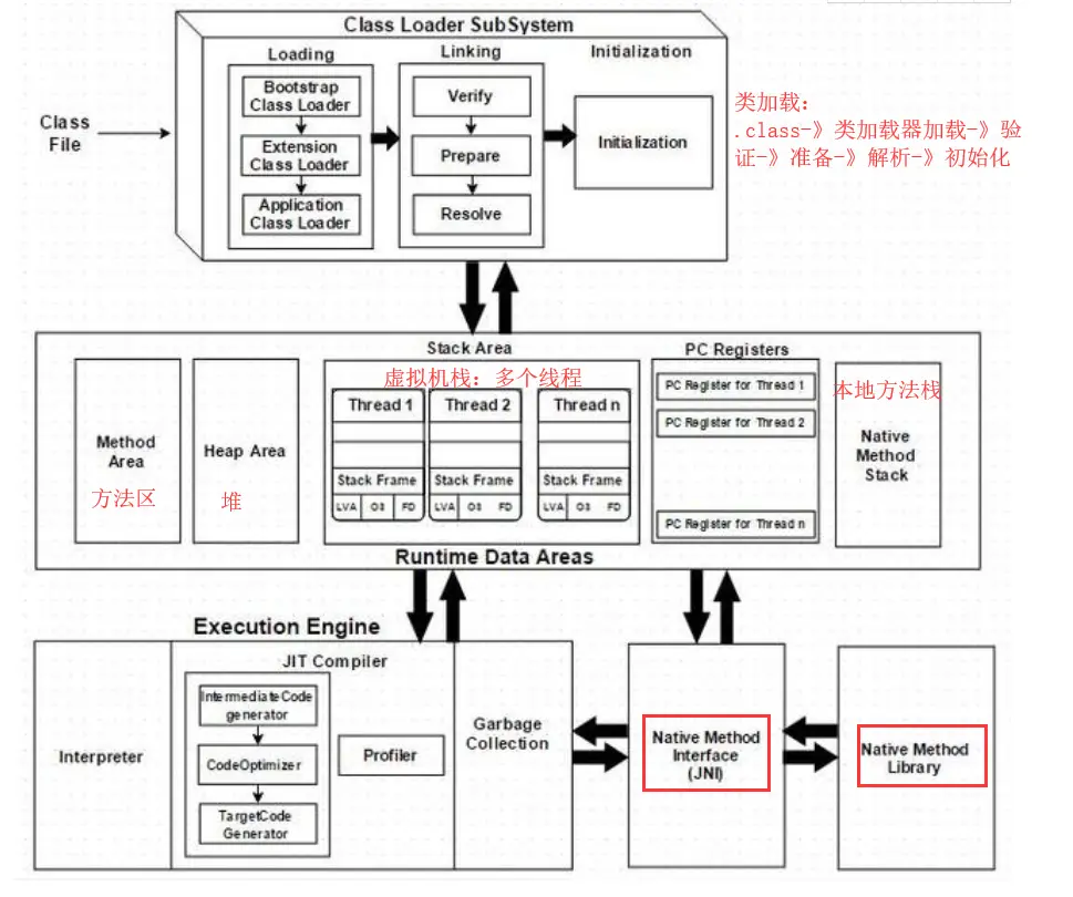 - 什么是jvm:虚拟出来的计算机,是jre的一部分,使用jvm是为了支持与操作系统无关,实现跨平台,jvm内部体系结构主要分为三个部分:类加载器子系统,运行时数据区和执行引擎。