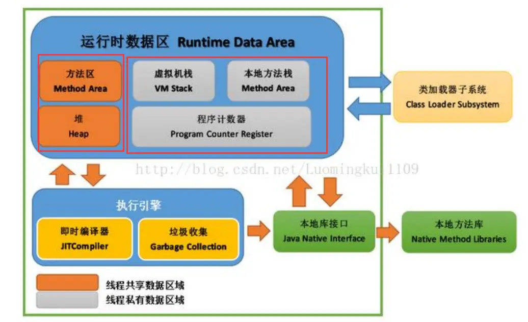 - 本地方法区:虚拟机栈执行java方法;本地方法栈执行native方法。比如java中调用C或C++中的方法,在这里执行。有的虚拟机会将虚拟机栈与本地方法栈合二为一。