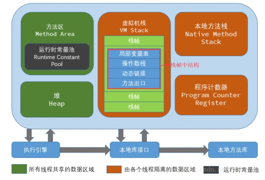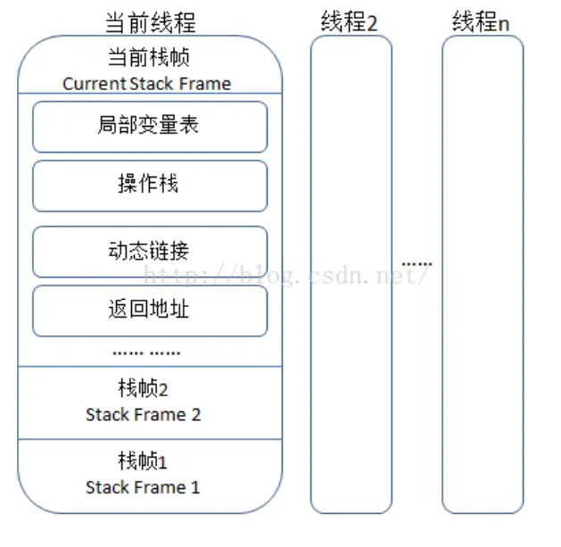 - 虚拟机栈:主要描述方法执行,每个方法在执行的时候创建一个栈帧,其中栈帧中存储了局部变量表,操作数栈,动态链接,方法出口等信息。每一个方法从调用到执行结束,对应着一个栈帧在虚拟机栈中入栈到出栈的过程。