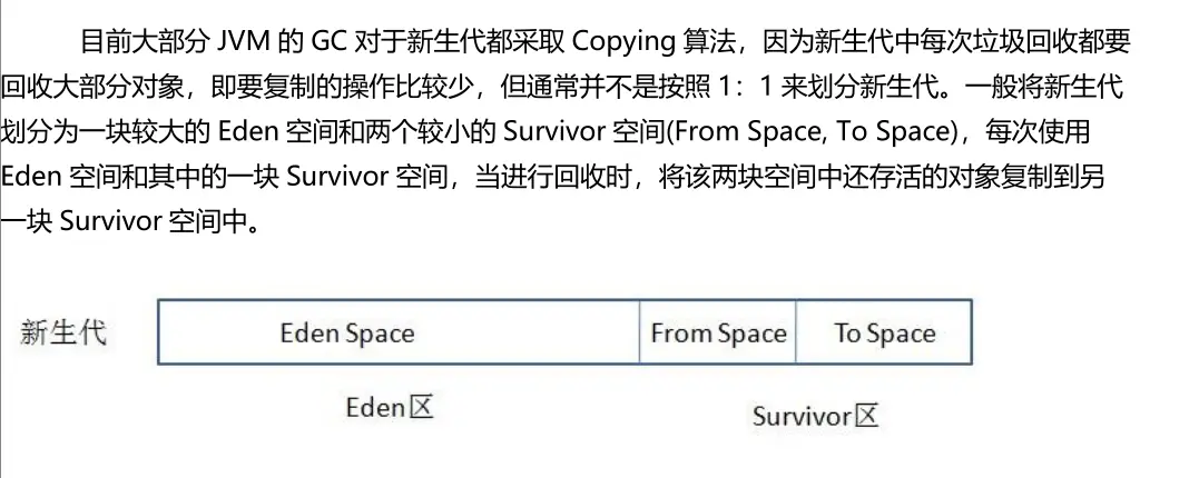 分代收集算法将heap区域划分为新生代和老年代,新生代的空间比老年代的空间要小。新生代又分为了Eden和两个survivor空间,它们的比例为8:1:1。对象被创建时,内存的分配是在新生代的Eden区发生的,大对象直接在老年代分配内存,IBM的研究表明,Eden区98%的对象都是很快消亡的。