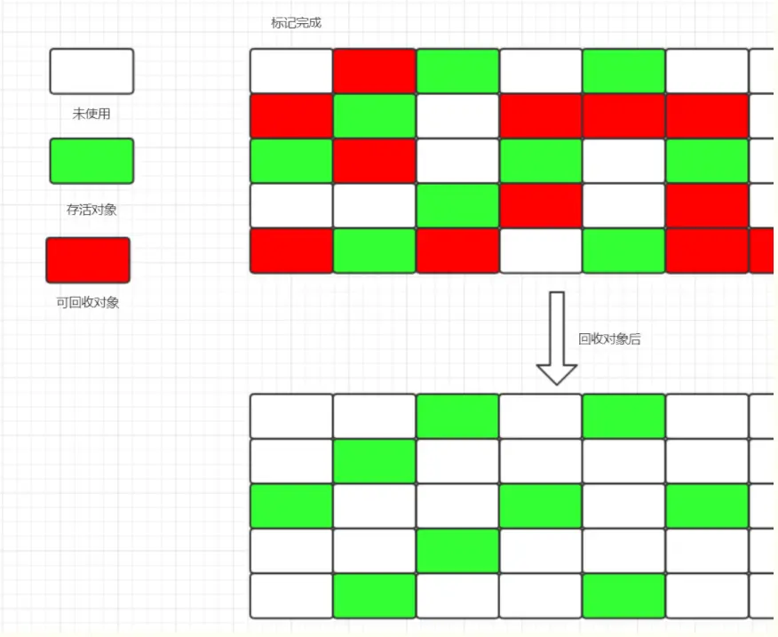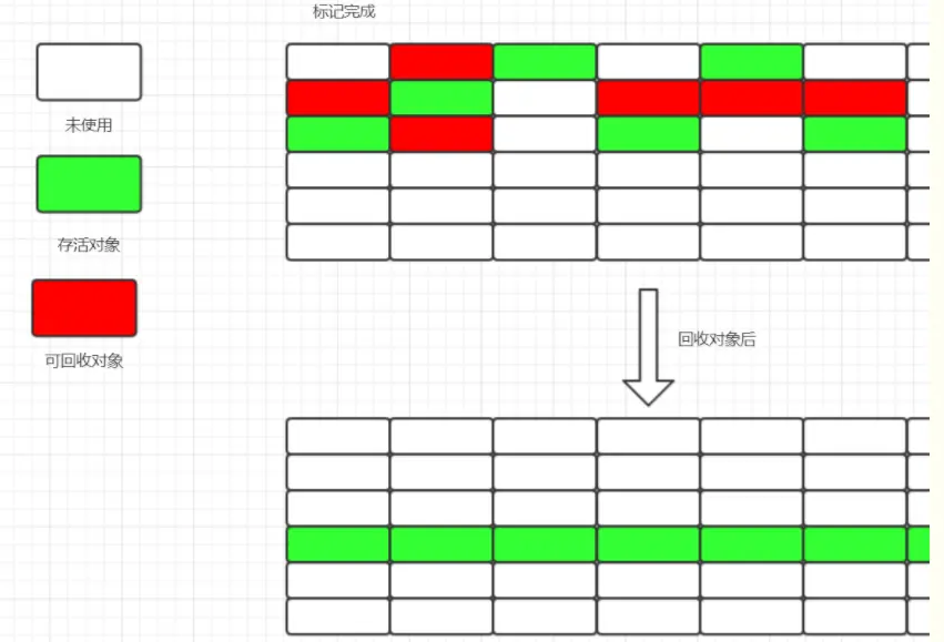 根据老年代的特点,有人提出了标记-整理的算法,标记过程仍然与标记-清楚算法一样,但后续步骤不是直接将可回收对象清理掉,而是让所有存活的对象都向一端移动,然后直接清理掉端边界以外的内存,算法示意图如下: